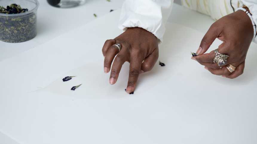 "Talvez eu não pinte, talvez eu semeie”, diz Juliana dos Santos. Não é apenas uma metáfora. É literal. A artista trabalha em colaboração com a flor Clitoria ternatea, de um azul intenso. Primeiro, um pulso rápido no liquidificador para soltar as pétalas; depois, água sobre o tecido. Com as mãos, sopra e pulveriza os fragmentos da flor sobre a superfície, como uma abelha que poliniza um campo. No lugar do pólen, o que se espalha é a cor sobre o branco.