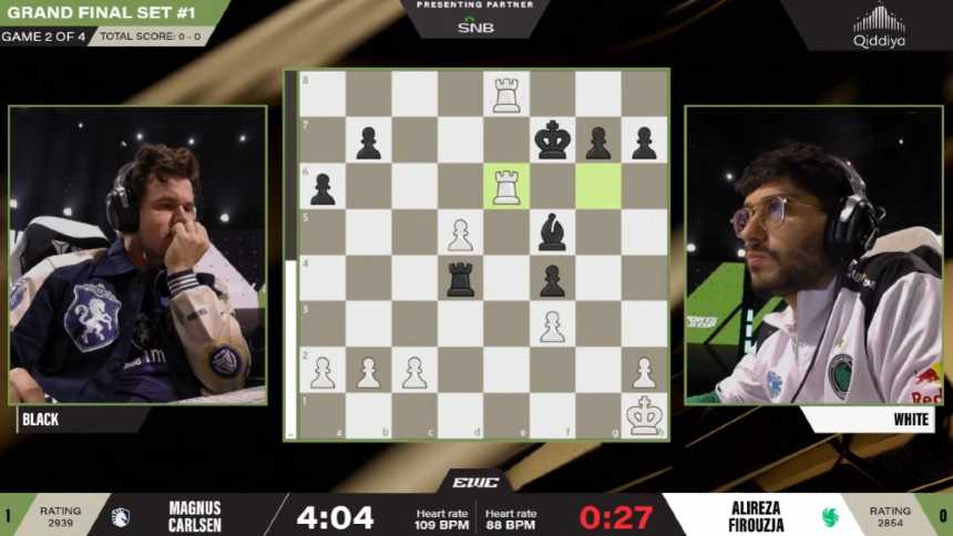 Na Esports World Cup, a estreia do xadrez foi marcada pela final entre o norueguês Magnus Carlsen e o iraniano-francês Alireza Firouzja, dois dos grandes nomes da modalidade atualmente. A disputa foi vencida por Carlsen, de 35 anos. Ele ganhou notoriedade ainda adolescente, quando, aos 13 anos, empatou uma partida contra Kasparov.